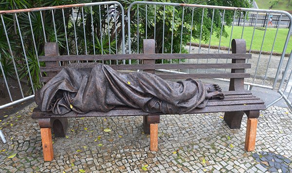 A partir do dia 18 de novembro, cariocas que passarem pelo Centro da cidade vão poder ver uma representação artística de Jesus Cristo diferente da imagem tradicional do filho de Deus para os cristãos. A escultura, doada por um artista canadense, representa o "Jesus sem-teto" deitado em um banco de praça com um cobertor fino sobre o corpo.