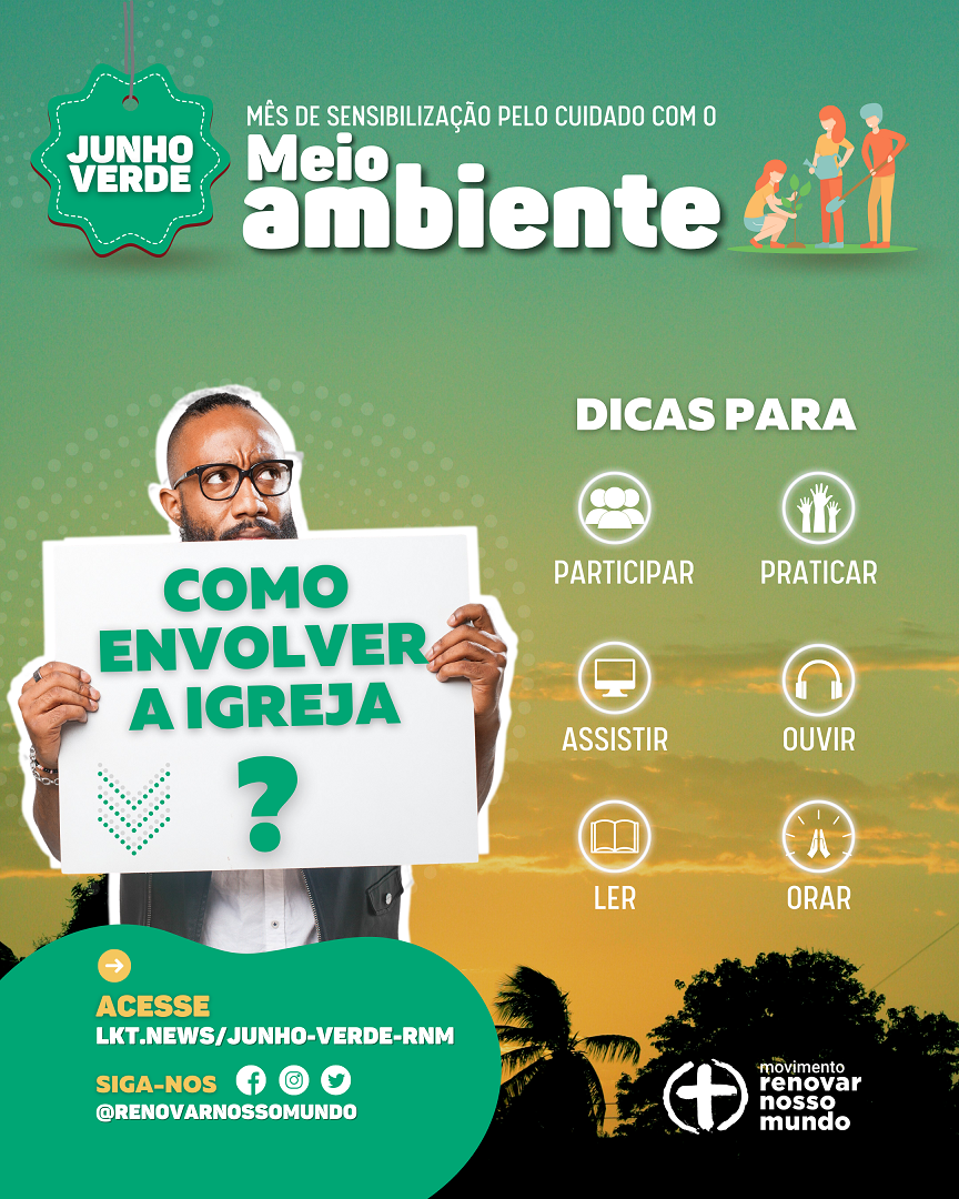 A Campanha Junho Verde tem como proposta dedicar o mês de junho para sensibilizar e engajar a sociedade quanto a importância do cuidado ambiental. O movimento ambiental cristão Renovar Nosso Mundo entra na campanha Junho Verde e aproveita a oportunidade para convidar igrejas evangélicas a participarem. Há sugestões de ações e atividades para o mês todo.