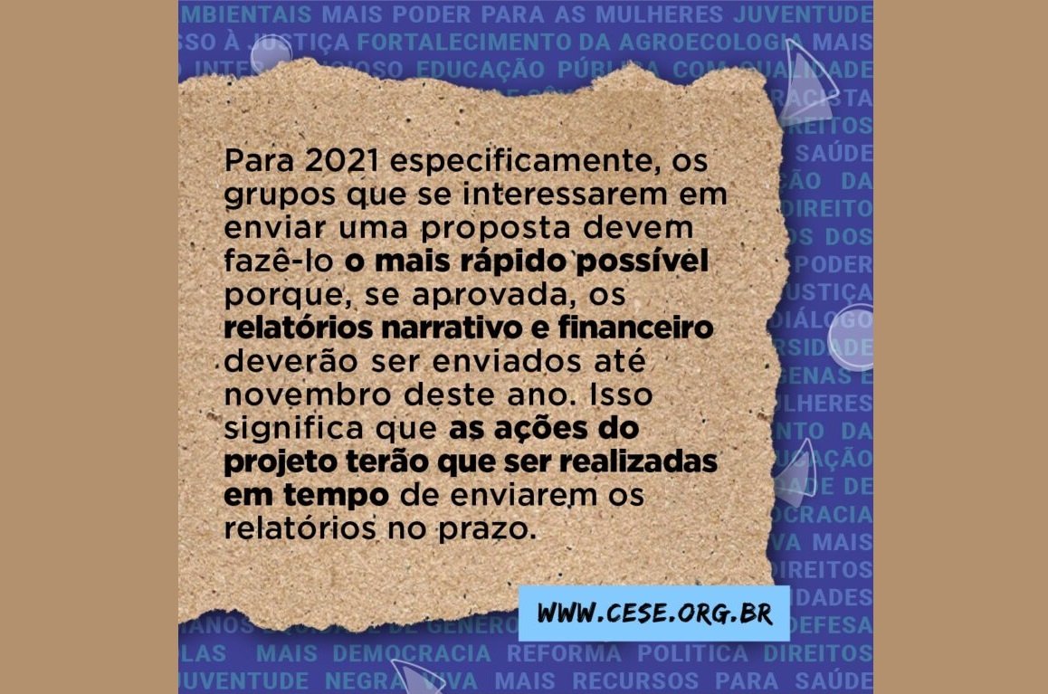 A CESE continua recebendo pequenos projetos para apoio neste ano de 2021, através do Programa de Pequenos Projetos (PPP). E incentivando movimentos sociais, organizações populares, fóruns e articulações, serviços diaconais ecumênicos e pastorais a enviarem propostas.